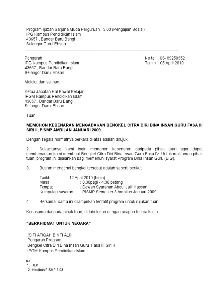 Doc Contoh Surat Memohon Kebenaran Mengadakan Big Kepada Pengarah Dokumen Tips